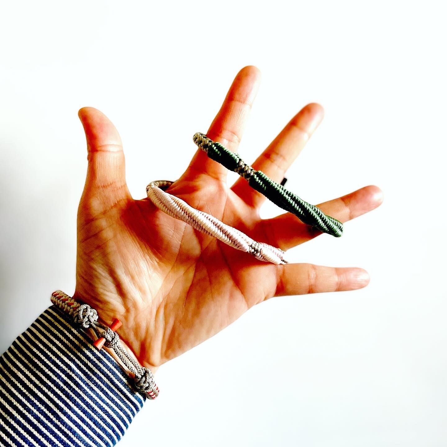 手首サイズについてですが、アジャスターのないスッキリとしたデザインを優先している為、木の留め具の抜け防止として、構造上、留め紐部分に多少のテンションが掛かる必要がございます。その為、手首サイズに【5mm〜8mm】程ゆとりがとれるサイズをお勧めしております。