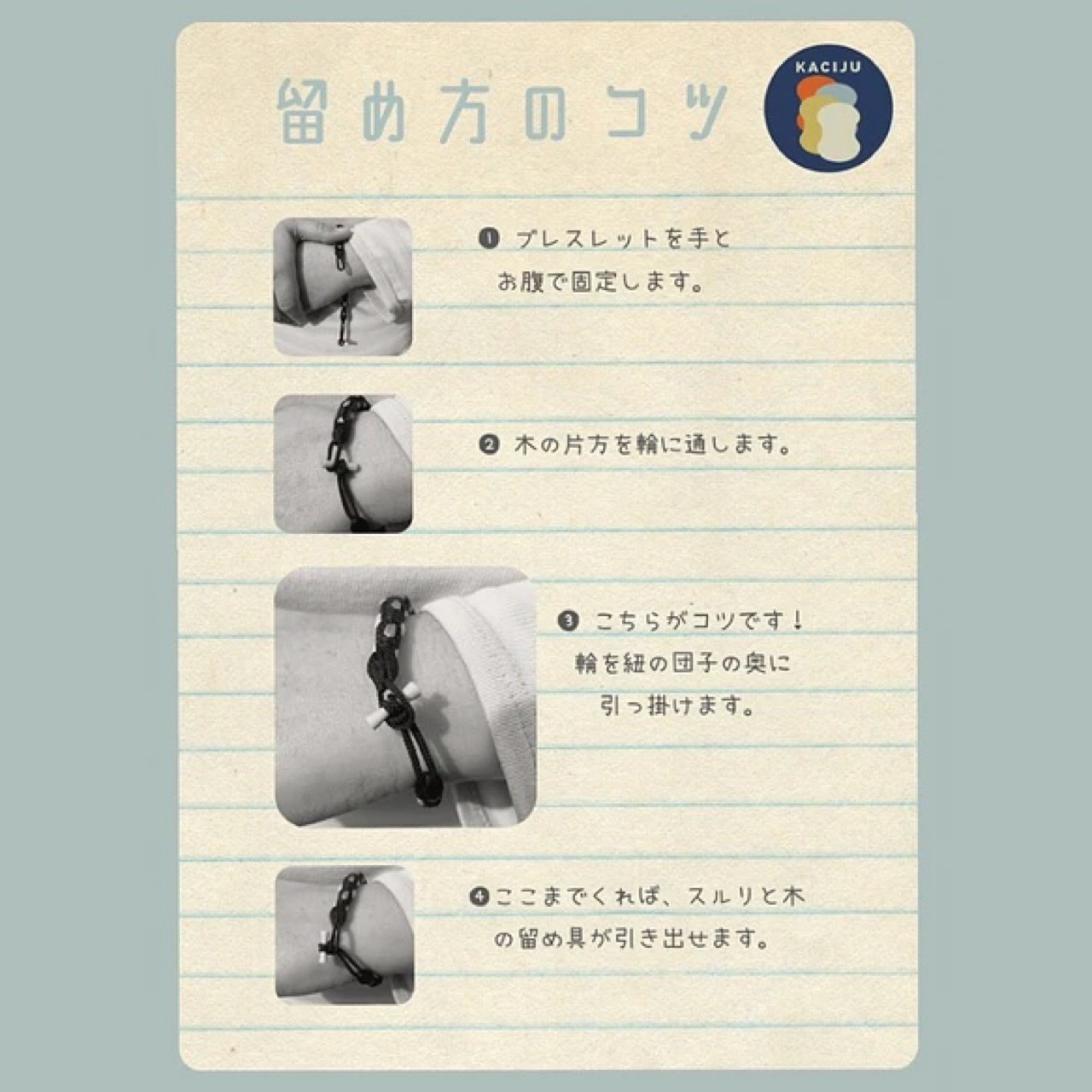 手首サイズについてですが、アジャスターのないスッキリとしたデザインを優先している為、木の留め具の抜け防止として、構造上、留め紐部分に多少のテンションが掛かる必要がございます。その為、手首サイズに【5mm〜8mm】程ゆとりがとれるサイズをお勧めしております。
